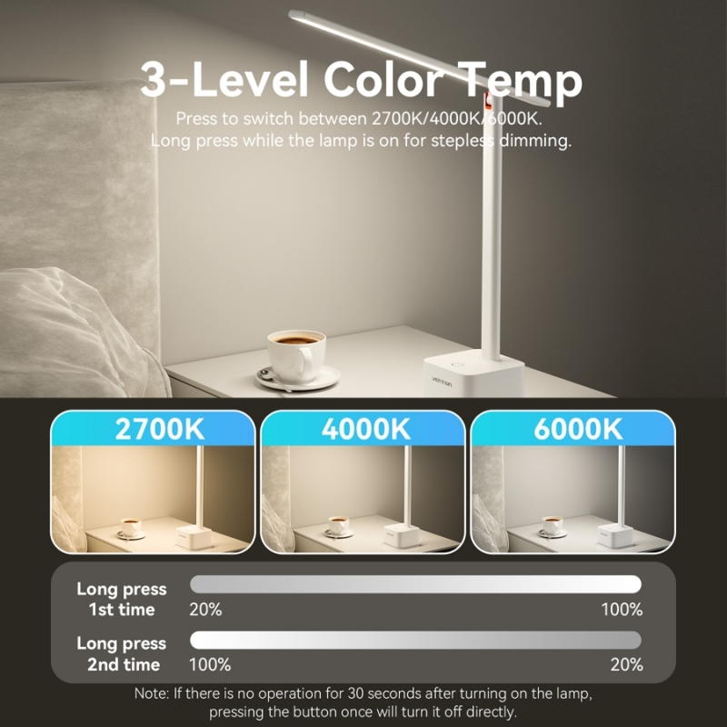 Đèn bàn Vention 3 cấp độ nhiệt độ màu, sạc USB-C, cắm điện, gập 180°, không nhấp nháy, bảo vệ mắt cho học sinh, giáo viên, người lao động, học tập, làm việc, đọc sách.