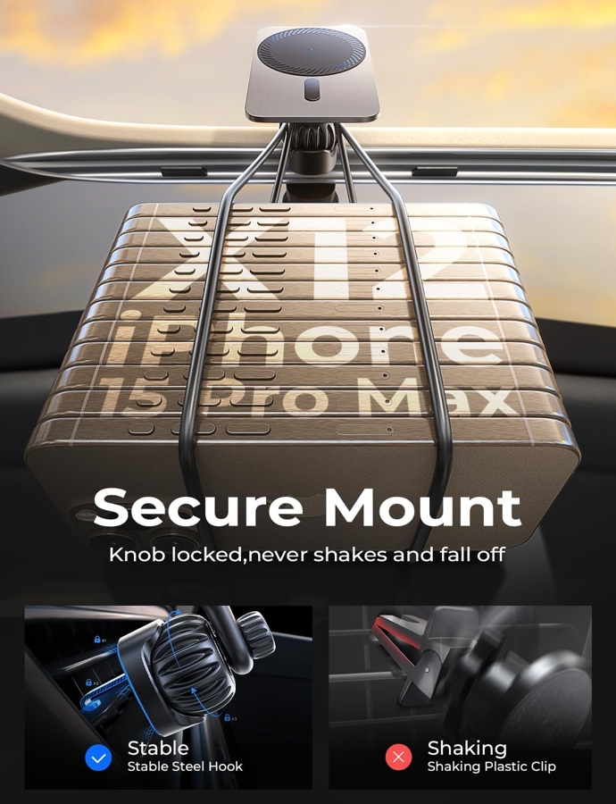 Cấu trúc móc thép cố định và tay nối dài thông minh đảm bảo thiết bị ổn định, không cản tầm nhìn, và tránh hiện tượng quá nhiệt khi sạc lâu.