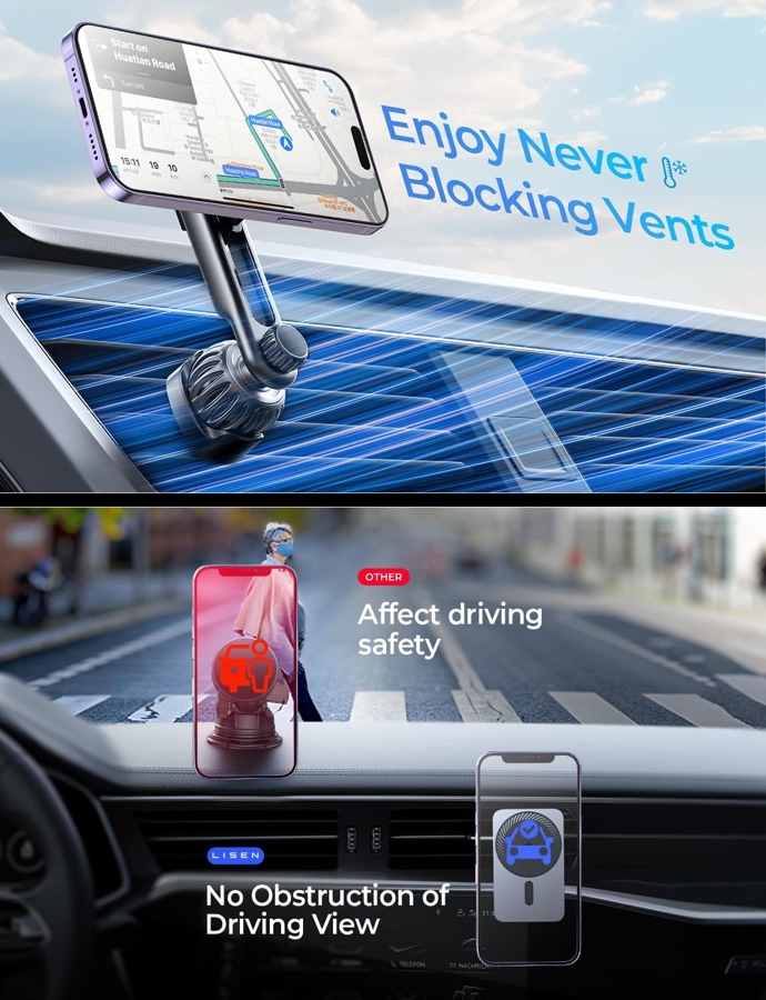 Khác biệt của LISEN Metal Magnetic Wireless Car Charger nằm ở hệ thống từ tính MagSafe siêu mạnh, giúp điện thoại bám chặt dù xe rung lắc hay vào cua gấp.