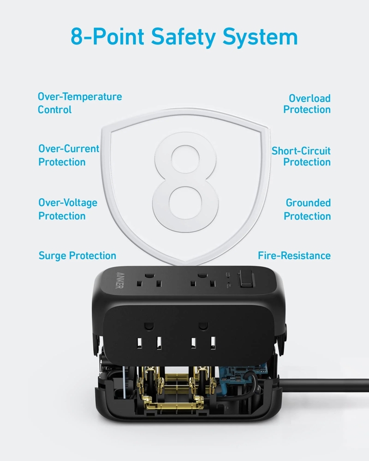 Không chỉ mạnh mẽ, ổ điện đa năng Anker 332 còn được trang bị hệ thống an toàn 8 điểm bao gồm chống cháy, chống đột biến, bảo vệ quá tải, quá nhiệt… đạt chuẩn TUV / FCC / CP65. Mỗi lần sạc là một lần an tâm, đúng tinh thần “bền bỉ và an toàn” đặc trưng của Anker.