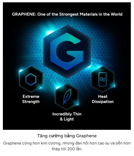Được tăng cường bằng Graphene: Graphene cứng hơn kim cương, nhưng đàn hồi hơn cao su và bền hơn thép tới 200 lần.