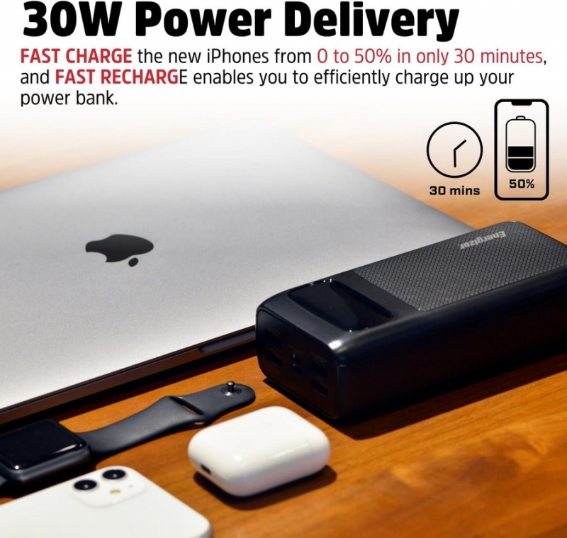 Trang bị cổng USB-C Power Delivery 30W, Sạc dự phòng Energizer UE30063PQ giúp nạp đầy năng lượng cho điện thoại, máy tính bảng, tai nghe hay thậm chí cả laptop hỗ trợ PD một cách nhanh chóng và an toàn. Đây là công nghệ được đánh giá cao nhờ khả năng tối ưu hóa dòng sạc theo từng thiết bị, giảm nhiệt và tăng tuổi thọ pin.