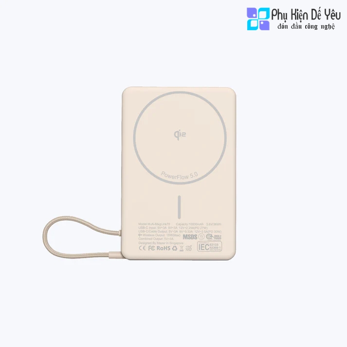 Pin dự phòng không dây từ tính Mazer MagLink70 là giải pháp năng lượng hiện đại dành cho người dùng yêu công nghệ, thường xuyên di chuyển và đề cao sự gọn nhẹ – tiện lợi. Sản phẩm thuộc phân khúc pin sạc dự phòng Mazer chính hãng, sở hữu dung lượng 10.000mAh, hỗ trợ sạc không dây Qi2 15W, sạc nhanh 30W PD/PPS, tích hợp cáp USB-C, đạt chuẩn pin dự phòng an toàn CCC, đáp ứng hoàn hảo nhu cầu sử dụng hằng ngày lẫn du lịch dài ngày.