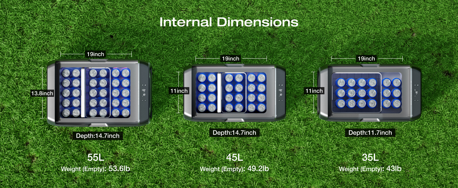 Với sức chứa 45 lít, tủ lạnh ECOFLOW GLACIER Classic 45L có thể chứa tới 72 lon nước ngọt 330ml. Dù dung tích lớn, thiết kế vẫn gọn gàng, tiết kiệm 40% diện tích so với các dòng tủ lạnh di động cùng dung tích khác. Kích thước 70,6 × 40 × 48 cm phù hợp để đặt trong cốp xe hay khu vực cắm trại.